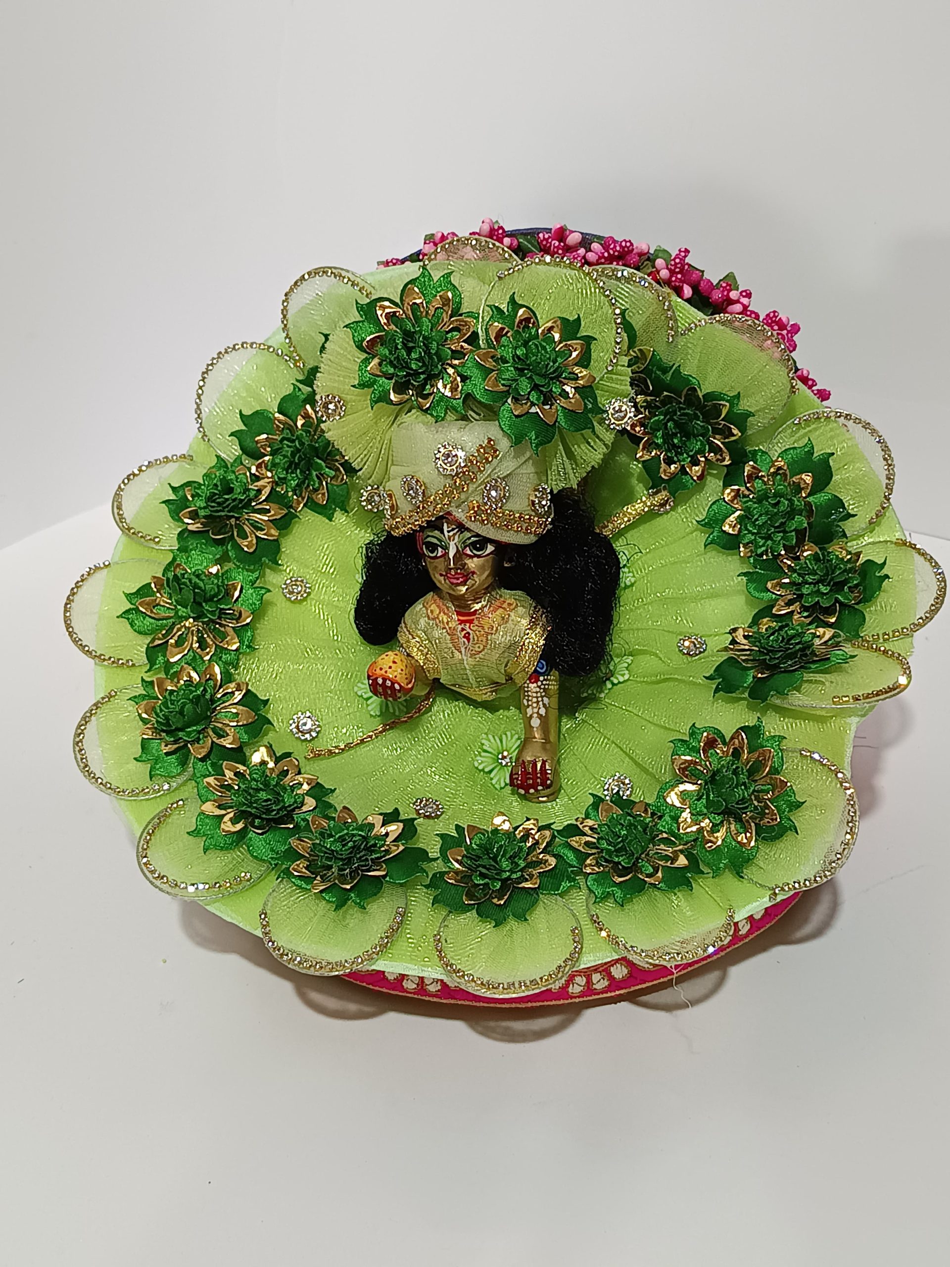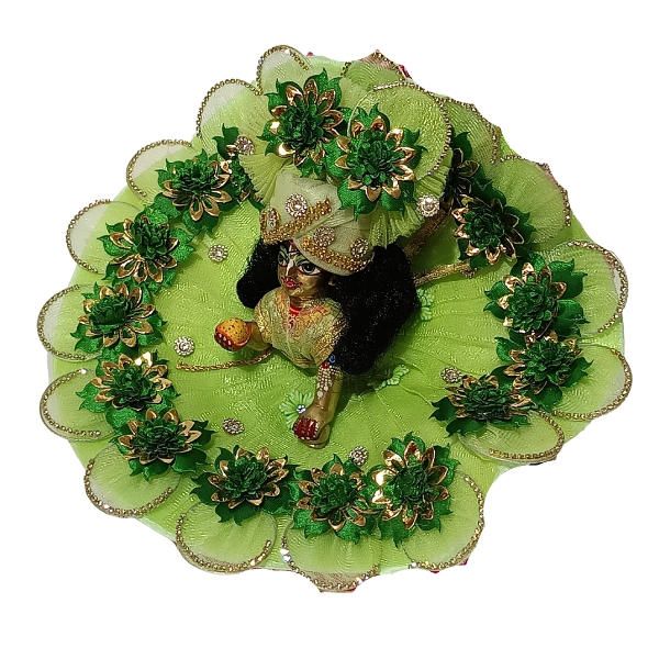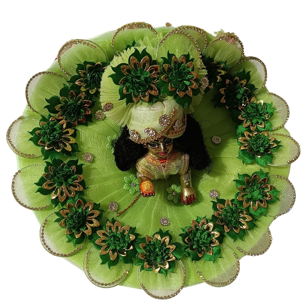 Adorn your beloved Laddu Gopal with this Beautiful Green Ring Petal Flower Dress, designed to reflect divine beauty and grace. Crafted with soft, petal-shaped layers in a soothing green shade, this dress resembles a blooming flower, symbolizing freshness and purity. The center features a delicate ring embellishment that adds a charming touch to the overall look.